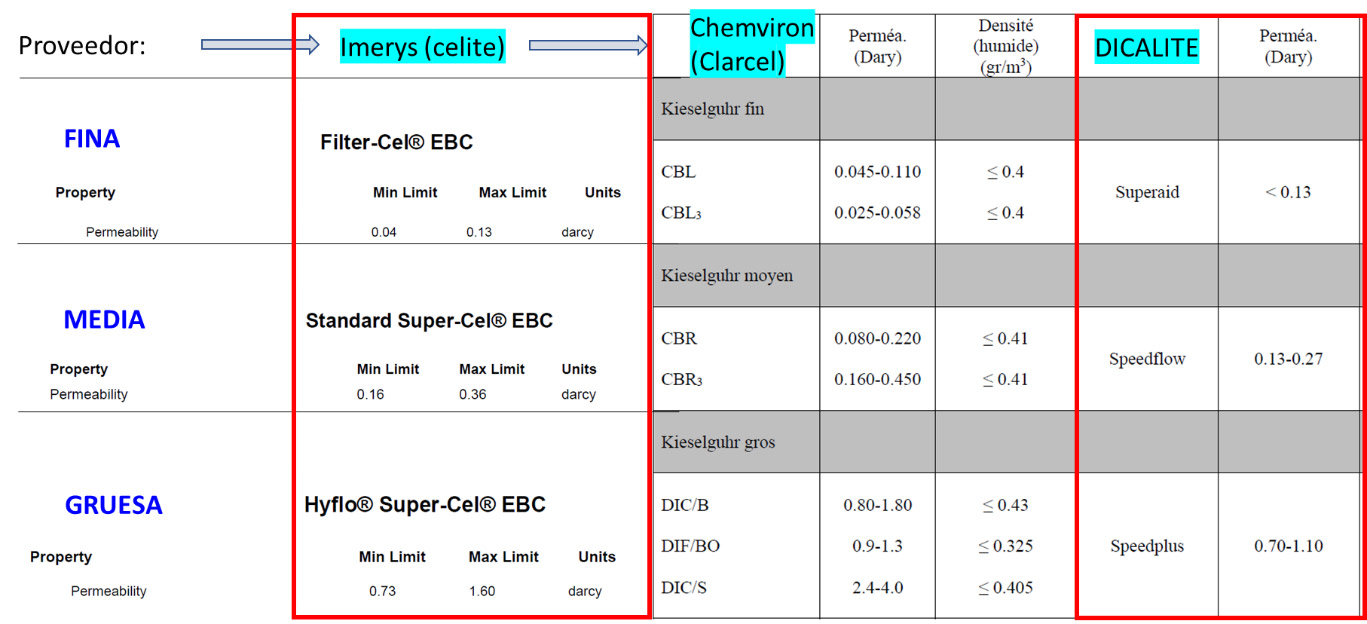 La tierra diatomea (kieselguhr) a evaluar proviene de tres proveedores Chemviron, Dicalite e Imerys, donde se buscó compararon los rendimientos del proceso de filtrado en condiciones similares a las del kieselguhr CLARCEL-Chemviron utilizado habitualmente en POMAR, cuyas especificaciones son: el filtro de velas BUCHER modelo SYNOX PF 1500 / 4700, con una superficie de filtración de 89 m² y un flujo nominal de filtración de 350 hL/h. En la Figura 1 se muestra las características de los medios filtrantes empleados y en la Tabla 3 las respectivas presentaciones de medio filtrante.